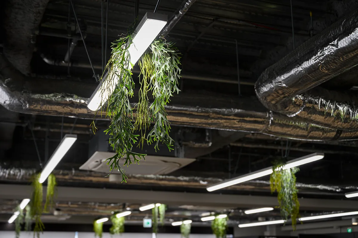 既存のスケルトン天井の持つ開放感と質感を活かし、スタイリッシュで洗練された雰囲気を基調に空間をデザインしました。さらに、BPORTUS様が提供する決済アプリやデジタルサービスの先進性に合わせ、空間全体をモノトーンで統一することで、機能的でスマートな印象を表現しました。エントランスにはコーポレートカラーのグリーンとブルーをアクセントとして取り入れ、ブランドらしさを来訪者に印象付ける工夫を加えています。