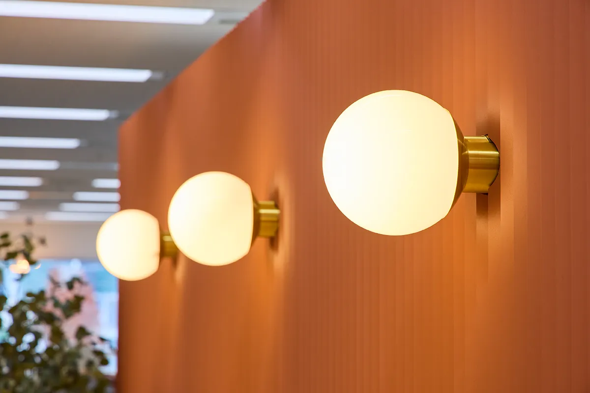 明るい木目やグリーンを基調としたナチュラルテイストの空間により、信頼・健康といった企業のメッセージや文化を体現しています。