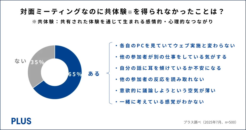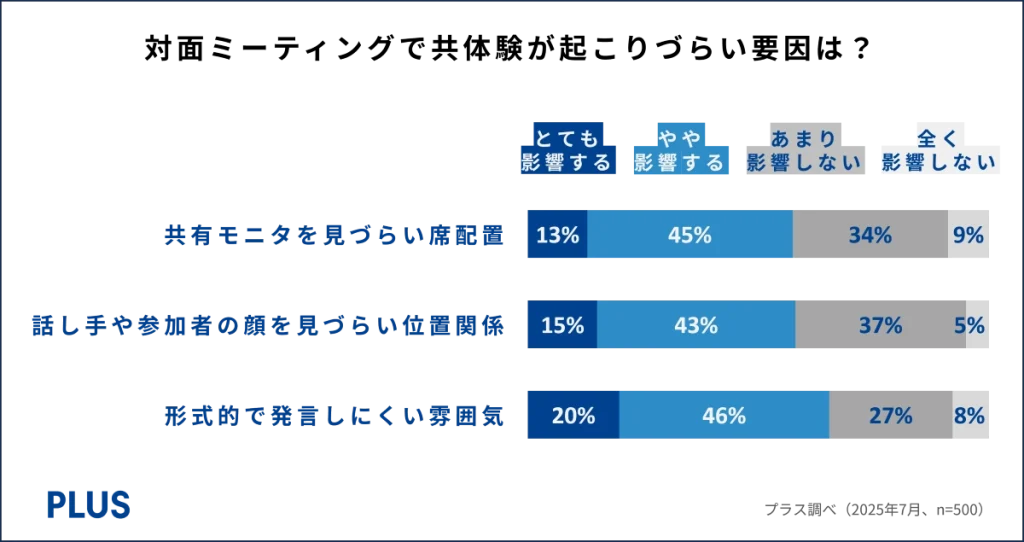 対面開催にもかかわらず参加者同士の方向や視線が合わない、議論に意識が向いていないといった課題が明らかに。これでは、ポジティブな気持ちで臨むことができず、ミーティングの質がさらに低下する悪循環に陥りかねません。