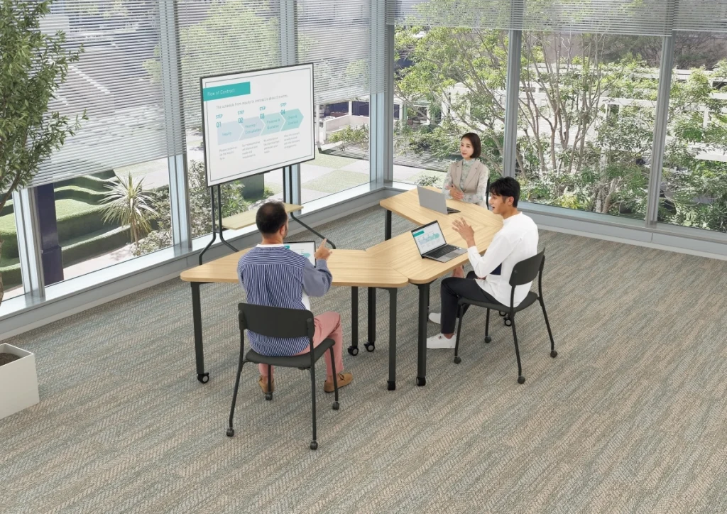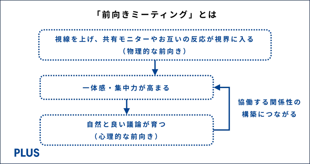 そこで、対面開催の価値を高めるひとつの方法としてご提案するのが「前向きミーティング」。これは、視線・体の向き・意識がひとつの方向に揃うことで一体感や集中力がうまれ、自然と良い議論が育つミーティングレイアウトです。
