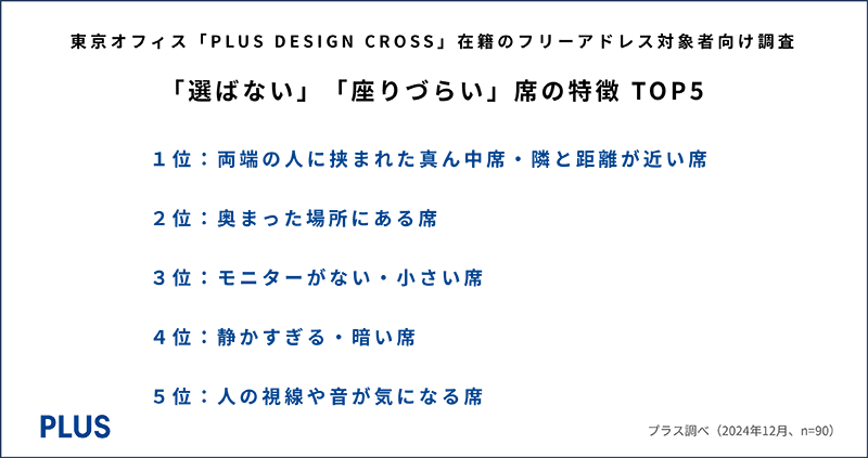 一方で、意外にも「奥まった場所にある席」は不人気であることが、社内調査からわかりました。「選ばない席」の特徴を調べたところ、「人の視線や音が気になる席」よりも「奥まった場所にある席」のほうが上位に挙がる結果に。