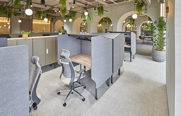 「集中ブース」や「個ブース」と呼ばれる、左右や前後をパネルで囲ったひとり用のデスク席は、周囲との距離感を保ち不意な声かけを避けられるため、業務に没頭しやすいのが特徴です。プラスファニチャーカンパニーの東京オフィス「PLUS DESIGN CROSS」でも利用率が高く、