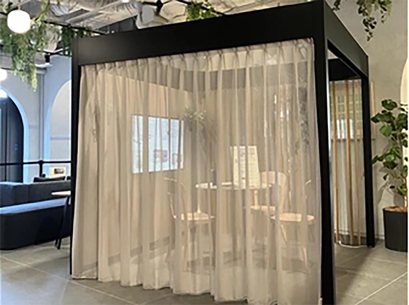 フレームにパネルやカーテンを組み合わせた、予約不要のプロジェクトワークスペースです。透過性のあるカーテンを閉じることで視線をゆるやかに遮りつつ、閉塞感のない半個室空間をつくれます。1on1、2〜3人でのペアワークなど、向き合って会話をしたり、一緒に考えながら手を動かしたりするのに適した場所としてよく利用されています。