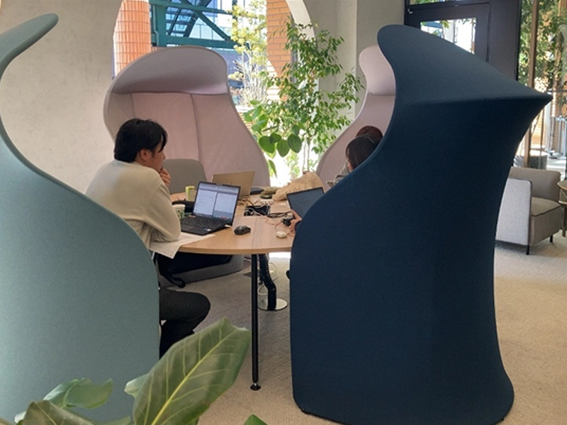 外から見る以上に視界が遮られるため周囲が気になりにくく、自然と会話が生まれるレイアウトになっています。チームでのブレストやちょっとした相談など、会話を中心としたコミュニケーションに活用されています。
