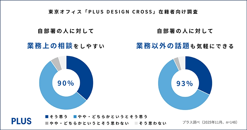 フリーアドレス席の導入により、他部門との交流や目的に合わせた席選びがしやすくなる一方で、同じ部署のメンバーと顔を合わせる機会が減るという声も多く聞かれます。フリーアドレス経験者向けに行った調査(プラス調べ(2023年12月、n=300))では、