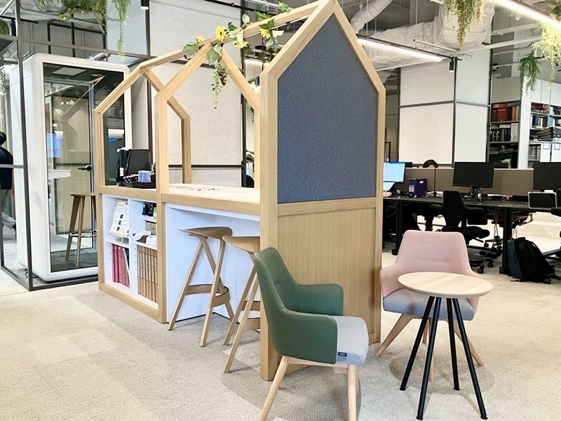 コミュニケーションスポットの設置に加え、「立ち寄りやすさ」「滞在しやすさ」「会話を始めやすいきっかけ」の小さな工夫を積み重ねることで、部署や立場を越えた何気ない会話が生まれ、オフィスの中に新しいつながりが育っていきます。