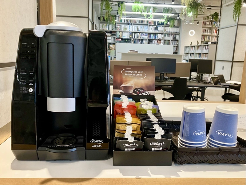 多目的に使える場であるだけでは交流は生まれにくいため、雑談を後押しする仕掛けが必要になります。そのひとつとして有効だったのが、コーヒーやおやつの設置です。ただし、目的は飲食の提供ではありません。軽く飲食を共にすることで仕事中とは異なる空気が生まれ、自然と心の距離が縮まり、本音での会話につながることを狙っています。